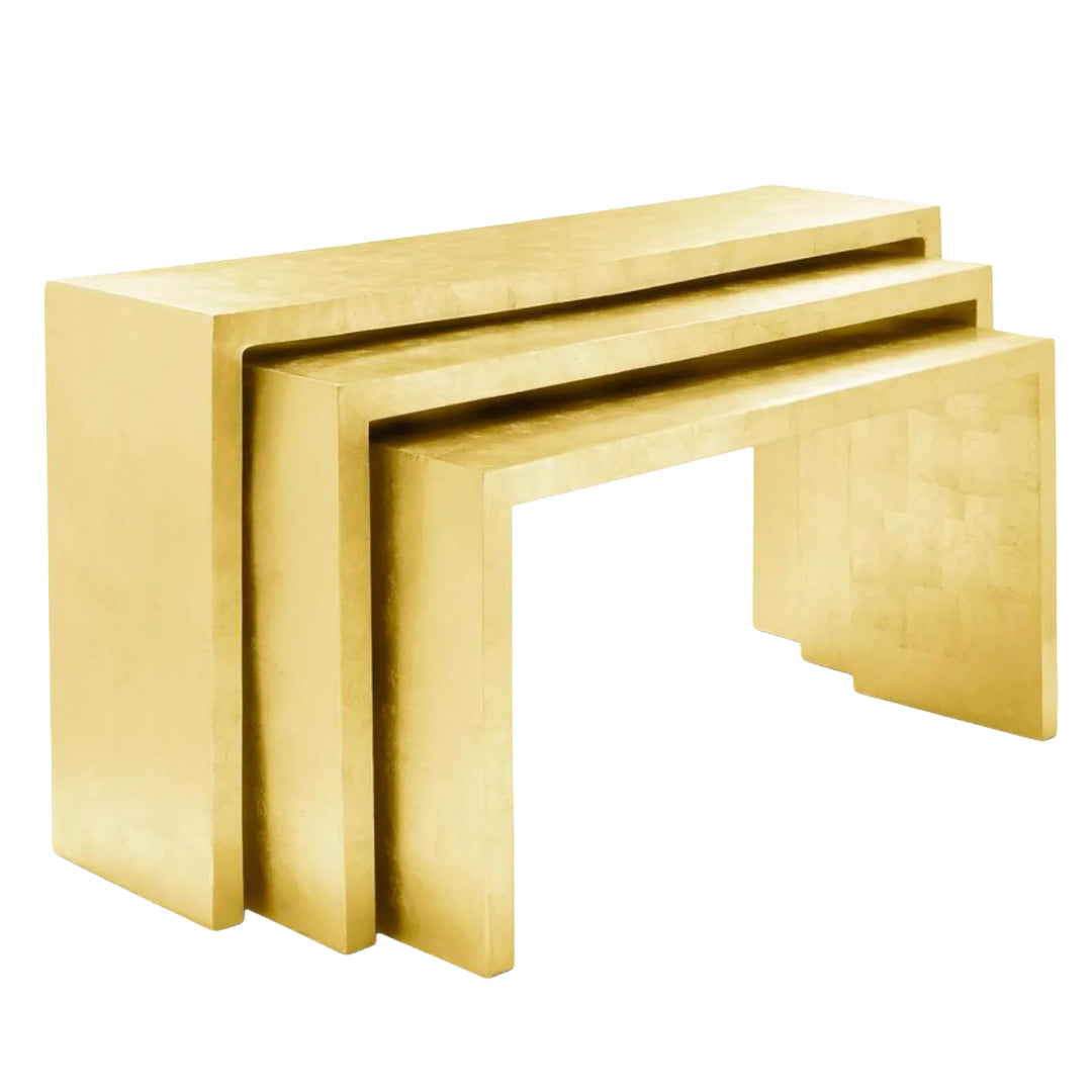Der Konsolentisch Venus präsentiert sich als dreiteiliges Set in klarer Formsprache und luxuriöser Goldoptik. Gefertigt aus besonders widerstandsfähigem synthetischem Harz, wirkt das Ensemble wie ein modernes Architekturstatement – vielseitig einsetzbar als Konsole, Sideboard-Ergänzung oder dekoratives Highlight im Entrée. Die drei Elemente lassen sich leicht versetzt untereinander „verschachteln“ oder unabhängig einzeln inszenieren.