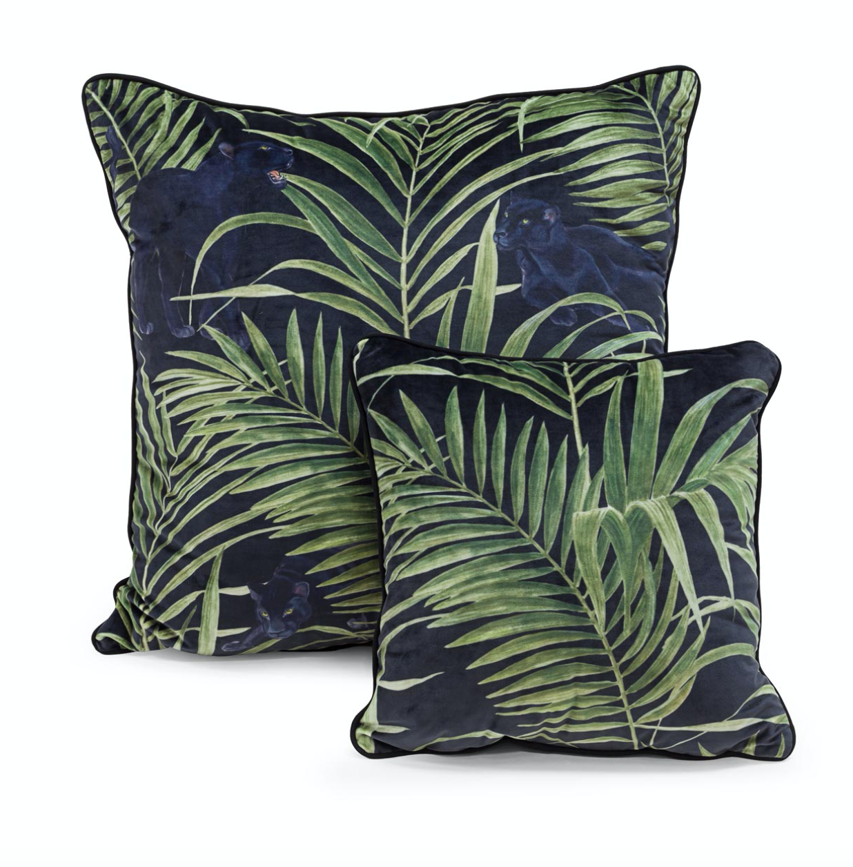 Dieses Kissenset besticht durch eindrucksvolle Motive von schwarzen Panthern in einer wunderbaren Dschungelkulisse. Hergestellt aus himmlisch weichem Samt und handgefertigt in Italien.